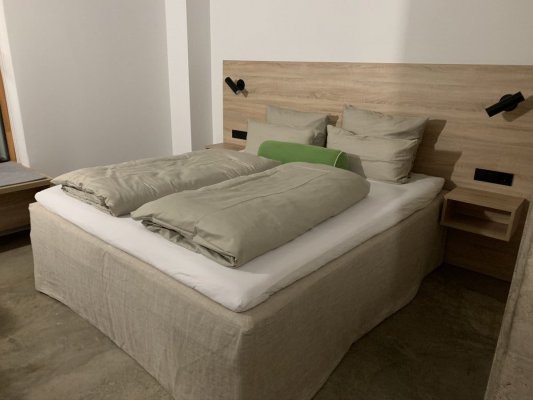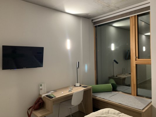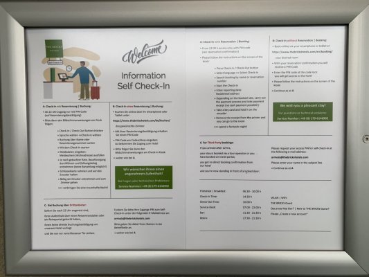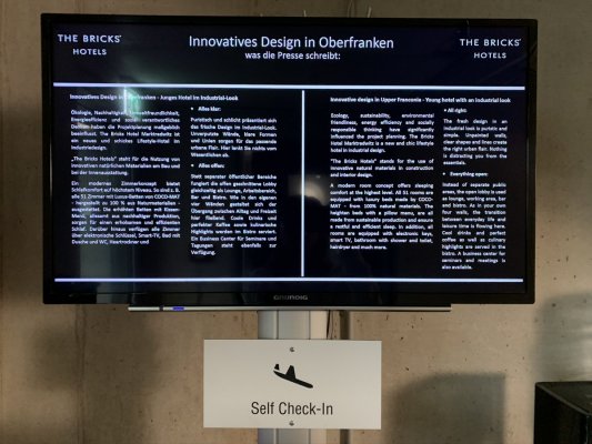 The Bricks Hotel расположен рядом с автобаном, который мы проезжали по пути из Мюнхена в сторону Польши. Отель стал нашей транзитной остановкой. Заселение у нас планировалось позднее, поэтому мы были готовы к тому, что на ресепшине нас встретит полусонный немец, который будет считать минуты до скорейшего нашего “good night”. Подъезжая ближе к точке назначения были смущены тем, что Marktredwitz - это деревня, где нету ни души в 11 вечера. Подъезд к отелю мало был похож на подъезд - вместо асфальта щебень. Но, радовало то, что на парковке было ещё 2 автомобиля, это выселяло надежду, что мы здесь не одни. Подойдя ко входу увидели надпись “self check in” и прямо на двери информацию как это сделать. Оказывается, при проигрывании мне прислали код для входа и внутри мы увидели стойку регистрации. Круто ! Это так современно и здорово. Мы ввели данные, активировали карту-ключ к номеру и все ! Такого я вообще не ожидала в глуши на автобане.