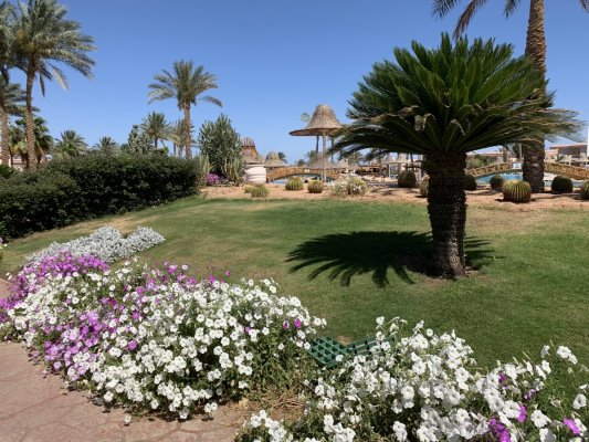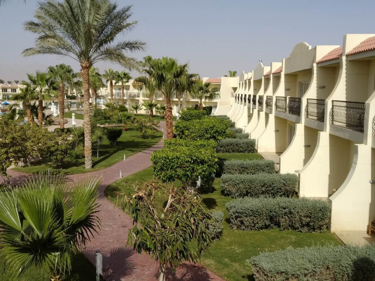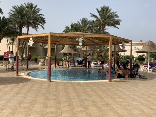 Территория отеля очень большая. Видно, что когда это был Rixos, отель следил за своим именем и статусом. Огромная река когда-то проходила по всей территории отеля, но воды там нет. Сейчас - это типичный египетский отель с не очень чистой территорией. Есть небольшая детская площадка и мини-клуб, в который мы так ни разу и не попали. Пляж типичный с деревянным пирсом. Рыбок мы видели, н немного. Очень неприятным моментом было то, что когда приходили отливы, появлялась мошкара, которая очень больно кусала и последние три дня нашего пребывания мы на пляж даже не ходили, отдыхали у бассейна.