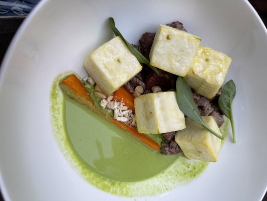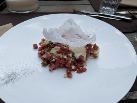 Просто ужас! Заказали самое дорогое блюдо в меню - «дичина під грибним соусом від ШЕФА», ... Ещё Просто ужас! Заказали самое дорогое блюдо в меню - «дичина під грибним соусом від ШЕФА», официант сказала что это мясо медведя су-вид, принесли нам куски то ли телятины, то ли вообще курицы, в которых из-за каких-то индийских специй даже не чувствуется вкуса мяса, и соус грибной это 5 капель, размазанных по тарелке. К ним подали еще жирные овощи, тоже в тех же ужасных специях, хотя официант сказала, что гарнира там нет, и нужно заказывать отдельно. А мясо медведя белого цвета кто-то вообще видел??? Лично мы кушали только тёмно-красного, но в ресторане Ханей наверное свои медведи...о су-вид вообще молчу. Рядом даже не стояло. Даже по фото видно. Как гарнир заказали «карамелізовані овочі з бринзою»..знаете что было в тарелке? 3 куска вареного буряка, 3 куска моркови, и 3 куска яблока, это всё карамелизировано и посыпано брынзой. Лично для меня понятие ОВОЩИ – это не буряк, морковь, и ЯБЛОКО. Такие нюансы нужно прописывать в меню детально!!!! Вообщем не рекомендую это заведение от слова СОВСЕМ!!!! А еще заказали вино, через 10 минут официантка подходит и говорит, что наше вино на складе закончилось, и хватает только на один бокал, либо же они могут разлить порцию по полам на два бокала, по 75 грамм. Предложить другое вино они не додумались...кароче, такого трешака в Буковеле еще не попадалось