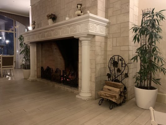 Особенно порадовал интерьер с панорамным видом на лес и камином.