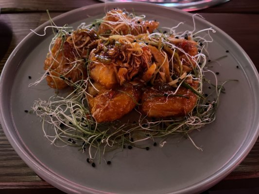 Меню сканировали, как сейчас делают в большинстве ресторанов. Выбор блюд не слишком большой, но каждый из компании нашёл что-то до себя. Я заказала креветки фри, которые подали с овощами и травами. Очень вкусно, в меру остро. Обслужили нас быстро и качественно. В целом, Ким Кимчи могу советовать.
