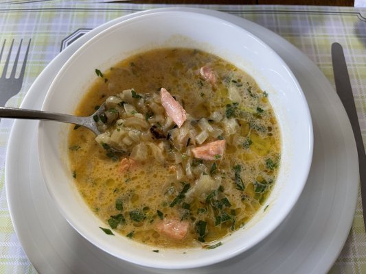 Вчера были ограничены по времени, но очень хотелось чего-то горячего на обед. По маршруту планировали приехать мимо Вери Велл, поэтому позвонила, забронировала стол и сделала заказ на время (за минут 20 до приезда). По приезду мы ещё 15 минут ожидали сливочный суп с лососем. «Запары» в кафе не было, это уже было после 15:30, почему так долго готовили суп не понятно. А сам суп принесли с горелым луком!!! КАК??? Руководство, примитесь уже меры, то вместо супа вода, то лук горелый…