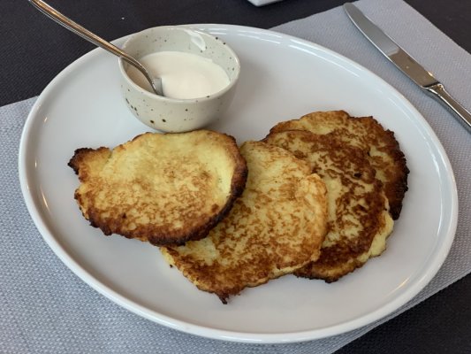 На обед заказывали борщ, который подают с салом и чесноком. Вкусно, но бывает лучше ) Что безумно понравилось на обед - это вареники из дикого кабана. На порцию подают 3 штуки, но они такие добротные, что вполне можно насытиться. Пробовали деруны - неплохо, но хотелось бы чтобы они были посуше, жирноватые.