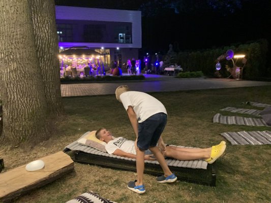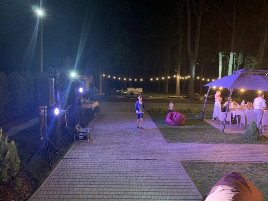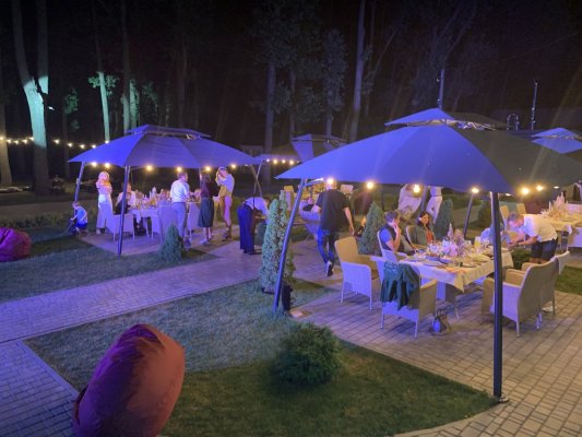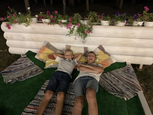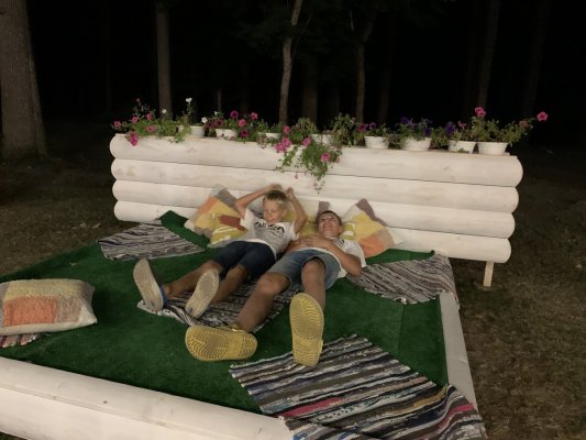 Впервые остановились большой компанией поужинать в ресторане поздним летним вечером. Нам предложили деревянную беседку с видом на лес. Тааак здорово, сумасшедший запах свежего леса. Рядом с отелем отмечали день рождения, играл диджей, было очень весело, уютно и вкусно.
