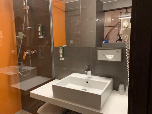 Наш номер был расположен на 2-м этаже, это был двухместный стандарт за 317 польских злотых (завтрак на двоих был включён в стоимость). Номер совсем небольшой, но вполне вместительный, оснащён мини-холодильником, чайником, и что самое крутое - гладильными принадлежностями. Небольшая ванная комната с стеклянной душевой кабинкой.