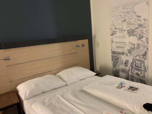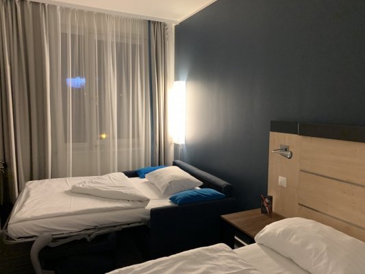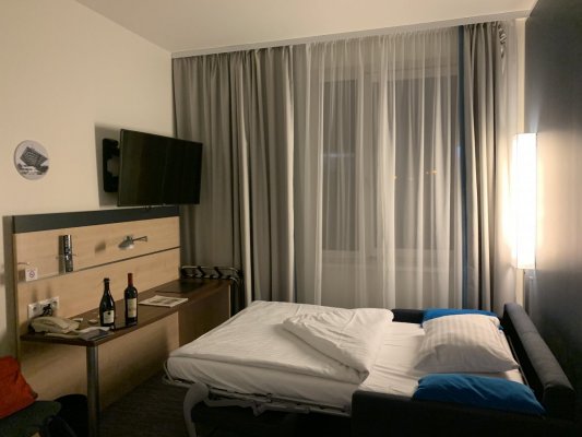 Стоимость номера с завтраком на двоих взрослых + ребенок 8 лет и 4 лет без предоставления отдельного места - 80 евро вместе с городским налогом. На ресепшене нас встретил русскоговорящий парень, который любезно нас оформил. Приятным бонусом было то, что парень подарил детям два подарка с какими-то безделушками, но сам факт. Нам предоставили Семейный номер, который был заявлен как номер на 23 метра. По факту, к сожалению, мы не ощутили этой площади. В номере был раскладной диван для сына, двухспальная кровать, где разместились мы с мужем и дочкой. Все впритык, не очень комфортно, особенно с детьми. В душевой все время отваливалась лейка, фиксатор был сломан.