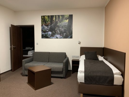 Поселили нас в двухкомнатный Plus Family Suits, т.к мы были с детьми. Стоимость номера 65 € (завтрак был включён) + городской налог 0,6 € на каждого гостя. Мы с мужем и дочкой вполне комфортно разместились на двухспальной кровати, сын спал в другой комнате на полутоном диване. Достаточно просторный номер с ванной комнатой. Отделка и мебель современные и качественные. В номере было тепло.